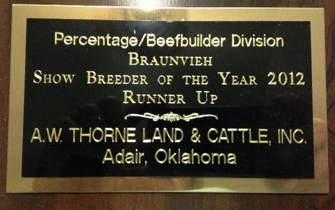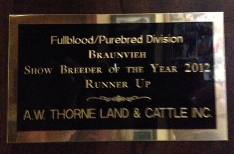 Thorne Ranch was named Runner Up for 2012 in both the Fullblood/Purebred Division. We thank our friends for exhibiting the TLC Herd Code and Thorne cattle to give us this award. We appreciate your hard work and dedication to make our genetics look and perform their best.
